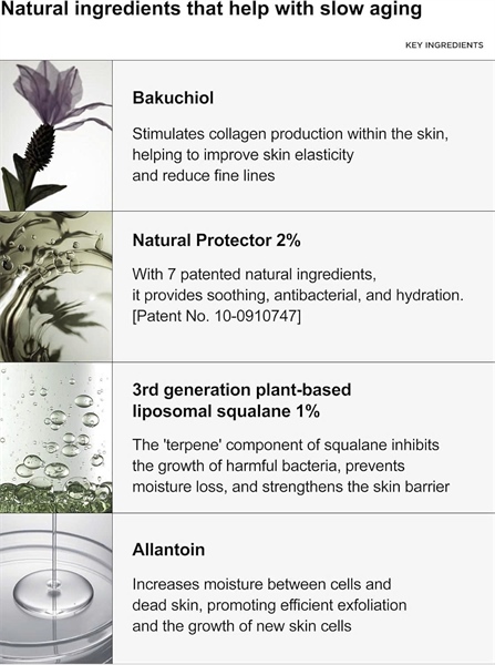– Squalane liposome thực vật thế hệ thứ 3 1%: Thành phần ‘terpene’ của squalane ức chế sự phát triển của vi khuẩn có hại, ngăn ngừa mất độ ẩm và tăng cường hàng rào bảo vệ da.