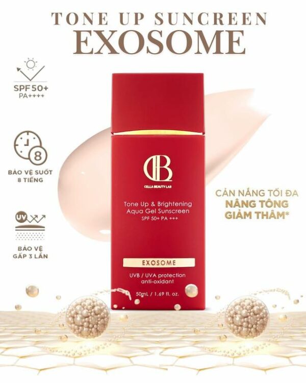 Kem Chống Nắng Đỏ Tone Up & Brightening Aqua Gel Sunscreen SPF 50+ PA+++ EXOSOME UVB/UVA là sản phẩm có chỉ số chống nắng cao, ngăn chặn tia UVB & UVA hiệu quả, đồng thời sở hữu công nghệ Exosome tiên tiến giúp làm dịu & phục hồi sâu cho da, kết hợp hiệu ứng nâng tone nhẹ giúp làn da bật sáng tự nhiên. Kết cấu gel mỏng nhẹ thấm nhanh, không gây bết dính – lý tưởng dùng hàng ngày, dùng trước lớp trang điểm hoặc khi ra ngoài nhiều.